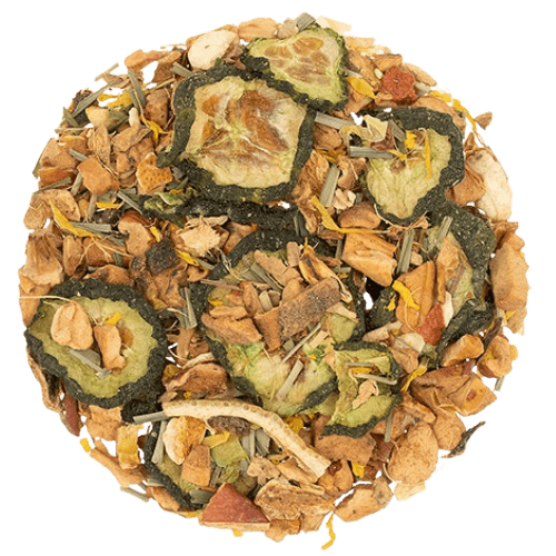 Lemon Cucumber Refresher, a luscious functional blend that draws on the natural antioxidant and rejuvenating properties of the fusion of ingredients. Each herbal was selected for its skin-affirming attributes and beautifying qualities. Apple and lemons are said to help brighten your skin and correct uneven skin tone due to their concentrated levels of vitamin C and antioxidants. Cucumber is a helpful hydrating agent that is also thought to contain vitamins that help rejuvenate the skin and anti-inflammatory properties to improve the appearance of large pores. Ginger and lemongrass are believed to energize the body and preserve skin's collagen. Bee pollen is said to stimulate growth of new skin tissue and prevent premature aging. Finally, calendula and marigold are thought to promote skin hydration and firmness.
